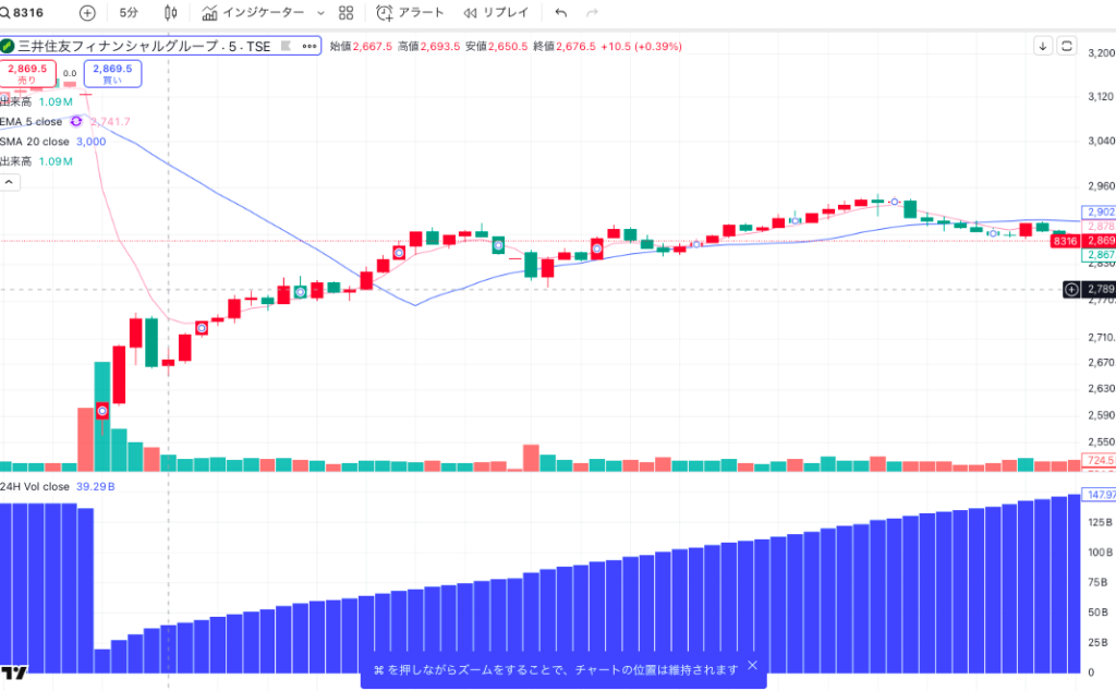 2025年4月7日の三井ファイナンシャルグループの5分足がこちら。トランプ関税による下げトレンドで、窓を明けて始まり、徐々に上がっていった三井ファイナンシャルグループの1日の価格推移。 このように上がっている。下げトレンドだから下がると思っていた... -