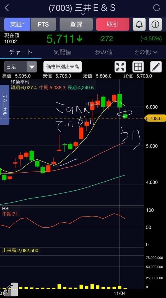 2025年10月28日、三井E&S(7003)が1株6260円のときに100株購入。11月7日に8%下落の逆指値に引っかかり、5760円で約定。5万円の損失。 11月チャートの形的に上放れ並び赤ではないかと思って買ったら、逆アイランドTOPみたいな形だったっぽい。困るね。... -